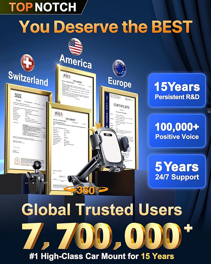 - 【2026 Ultimate Best = True Military-Grade + World-Class Safety Certifications】Built to authentic Military-Grade standards and validated by global safety agencies, this HTU car mount reflects 15 years of elite engineering. Certified Military-Grade (No. GZMR250702297501), RoHS (No. LINK-T2211264R), and CP65 (No. ATC210427-14141E)—delivering verified shock resistance, material safety, and long-term durability for real-world driving.
