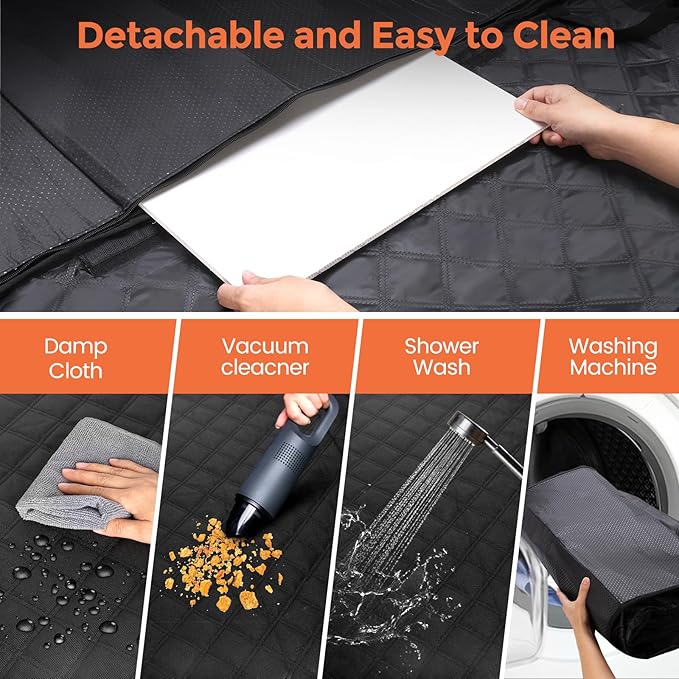 - Waterproof and Scratch-Resistant: This back seat pet cover for dogs combines a 7-layer reinforced design (600D Oxford Cloth, PVC waterproof coating, EVA non-slip base,35D cotton). The dog car seat cover for back seat protects your seats from dog hair, drool, waste and scratching claws, making dogs comfortable on car journeys. It's the perfect choice for road trips, the beach, or camping adventures