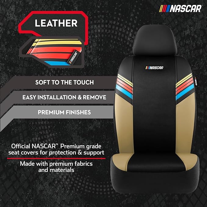 - PREMIUM QUALITY MATERIALS - Premium Leather & Breathable Mesh: High-quality beige leather combined with breathable mesh offers comfort, durability, and a racing-inspired interior upgrade, perfect for NASCAR fans seeking stylish Car Seat Covers for Cars, Trucks & SUVs.