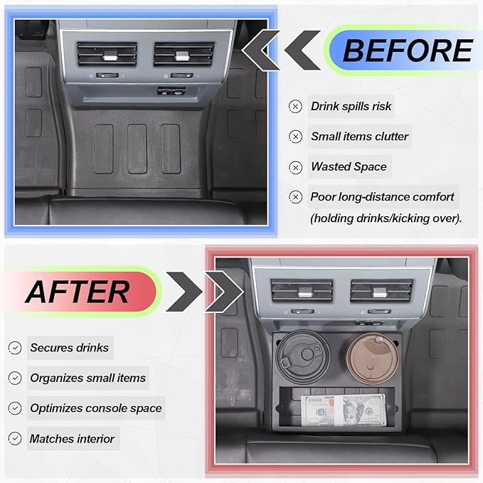 - 🏎️『Convenient & Practical』: The automotive Rear Floor Cup Holder Expander Organizer consoles & organizers to keep your vehicle tidy and clean. Create extra storage for your stuff by using this Center Console Accessory Organizer, Patented Design fits perfectly, convenient for placing smartphones, wallets, cigarettes, keys, hand cream, coins, gloves, credit cards, pens, maps, sunglasses, etc.