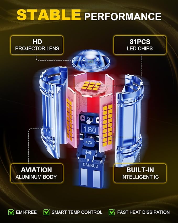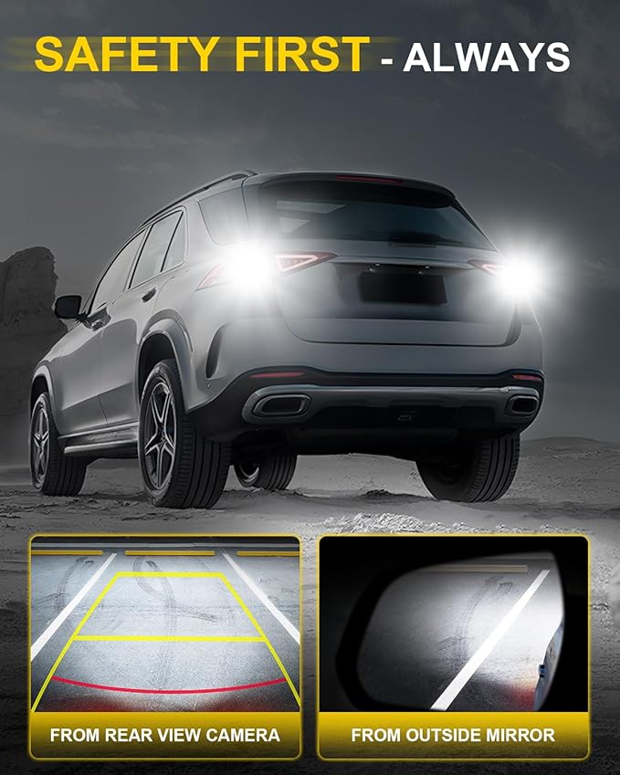 - 600% Brighter Than Traditional Halogen Bulbs:With the lens boosting light utilization, the 921 led bulb reverse light emits 6000K cool white light—600% brighter than traditional halogen bulbs. 360°full-angle light output with 81 high-precision SMD chips provides clear and bright illumination, enhancing visibility on the road and improving driving safety at night or in bad weather.
