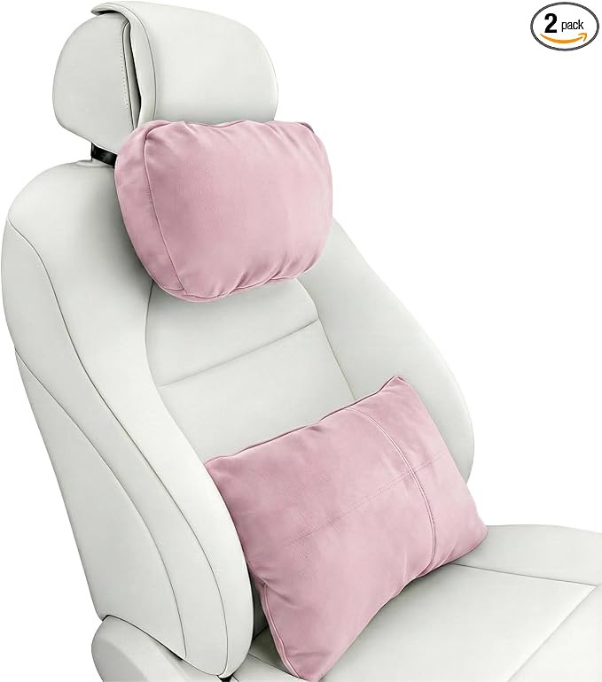 2PCS Car Pillow for Car Neck Pillow for Driving Seat Lumbar Support Soft Cushion with Extra Filling Accessories Back Support for Travel Nap and Trips Sleeping (Light Pink, Head and Lumbar)