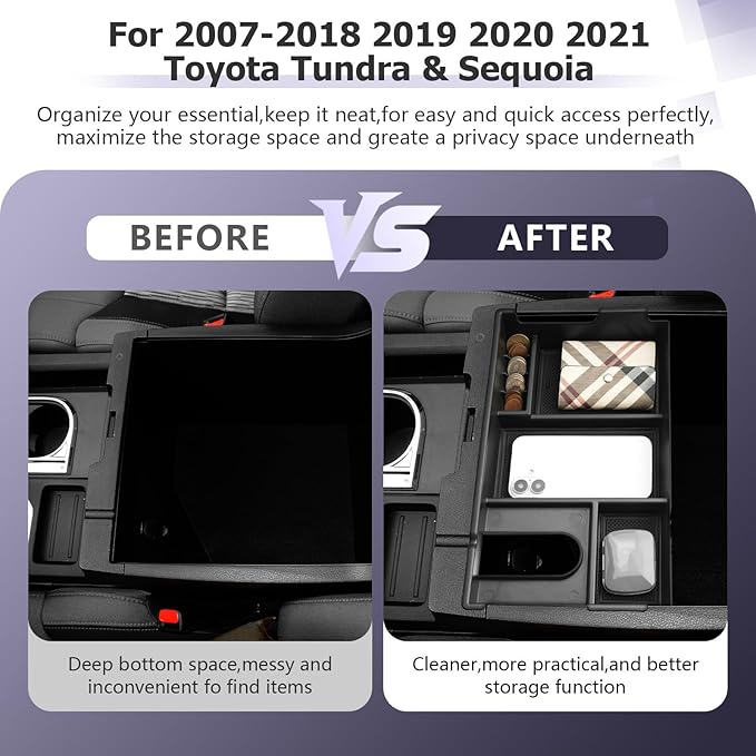 - Match Perfectly — The Tundra & Sequoia center console organizer has a specially customized size, which is very suitable for 2007 2008 2009 2010 2011 2012 2013 2014 2015 2016 2017 2018 2019 2020 2021 Toyota Tundra & Sequoia interior accessories, absolute necessities of automobiles and fashion items. Tundra & Sequoia accessories with multiple compartments to meet your needs for storing various items