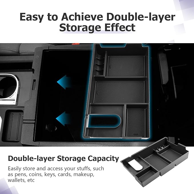 - Tool-Free Installation — Easily disassemble the Tundra & Sequoia accessories,car center console storage box, and directly insert the Tundra & Sequoia armrest console organizer into the center console, without modification, no cutting/tools. The Tundra & Sequoia center console organizer overall texture structure can be well integrated with the shift console, without abrupt display