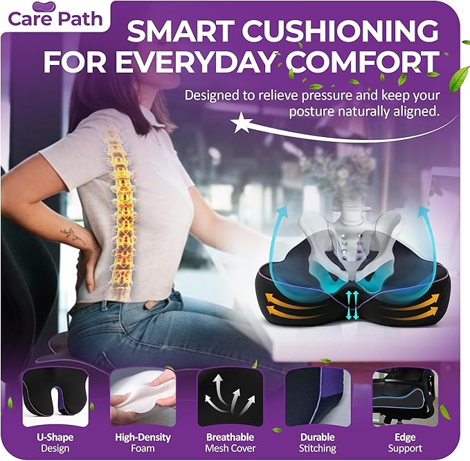 Carepath Memory foam seat cushion | Pain relief seat cushion for office chair, desk for long sitting, sciatica ,back & butt _Orthopedic office chair cushions for back pain, Car travel | Extra Dense