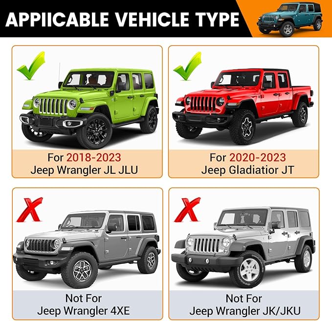 - Fit Models -- Compatible with 2018-2023 Jeep Wrangler JL JLU 4X4 &Gladiator JT. Note: Not for JK, 4XE and 2024-2025 model. Please check your car model carefully before purchase.