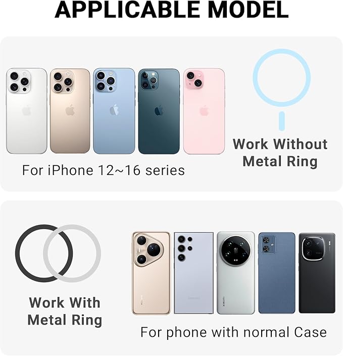- 【Wide Compatibility】Golf phone holder can attach directly to iPhone 16 15 14 13 12 series and is compatible with Magnetic cases. Additionally, Metal ring included in the package, it also works with non-magnetic phones and standard phone cases with a metal ring on their backs