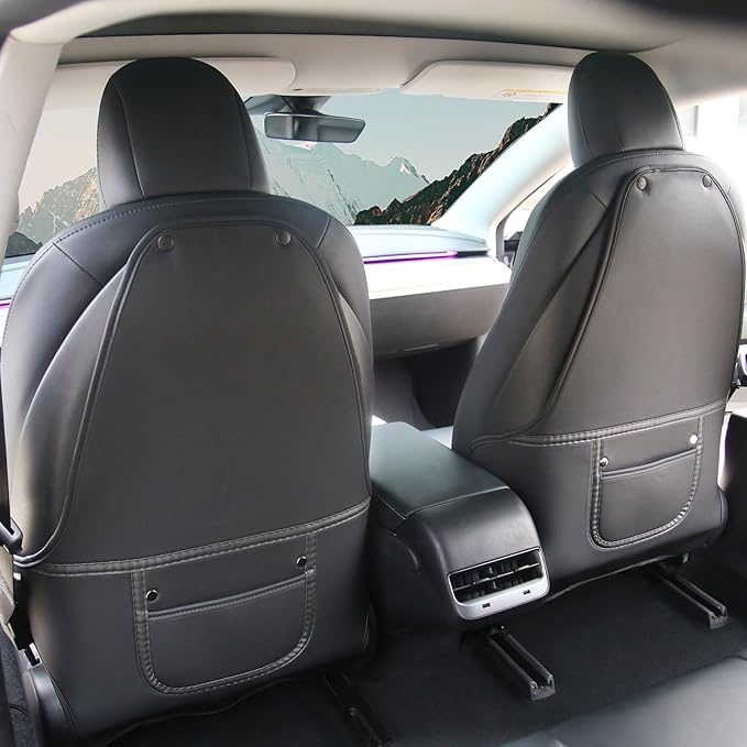 Seat Back Kick Protector Compatible with Tesla Model 3 2017-2025/ Model Y 2021-2025 Accessories, Leather Anti-scratch Kick Mat Cover with Organizer Pocket Black Seatback Protector for Kids Pets