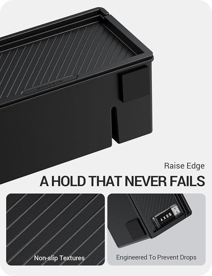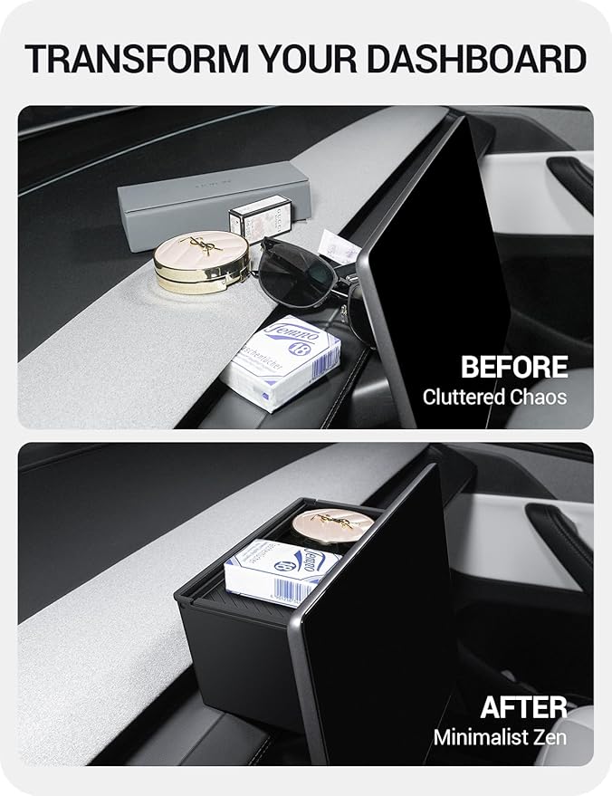 - Exclusive 2-Tier Privacy Storage: Distinguished from typical open-style organizers, BASENOR's behind-screen storage for the Model Y features an exclusive, innovative two-tier design. Our unique lid creates a hidden compartment perfect for securing valuables like ETC devices, wallets, and sunglasses, keeping them completely safe from prying eyes. The lid itself doubles as a stable, non-slip shelf with raised edges. This top layer ensures your everyday essentials stay firmly in place, preventing them from sliding off during sudden stops or sharp turns