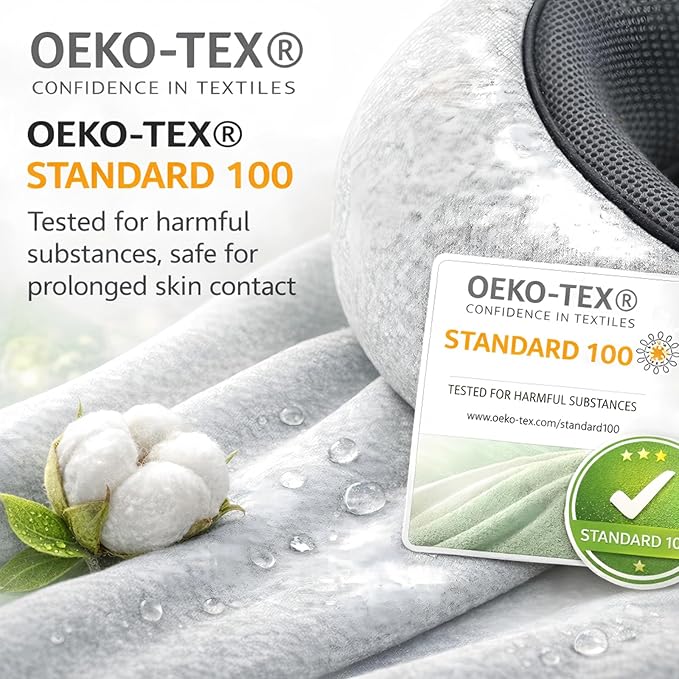 - OEKO-TEX Certified, Skin-Friendly & Breathable Fabric: The outer fabric is OEKO-TEX STANDARD 100 certified, ensuring it is tested for harmful substances and safe for prolonged skin contact. Combined with lightweight, breathable materials and 3D honeycomb weaving, this neck pillow enhances airflow, reduces heat buildup, and keeps you comfortable throughout your journey.