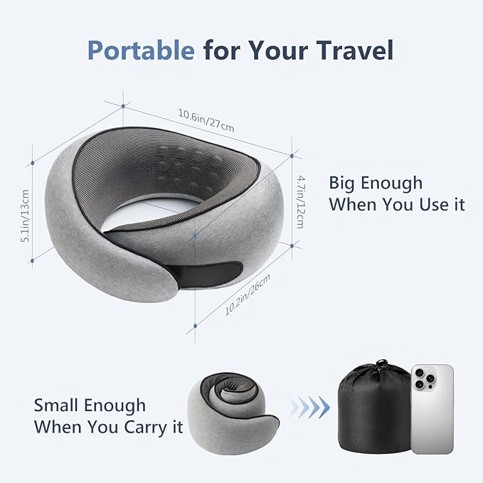 - Premium Memory Foam for All-Day Neck Relief: Made with high-density slow rebound memory foam, this travel neck pillow maintains consistent support without flattening over time. The ergonomic core evenly distributes pressure to support your cervical spine, helping reduce neck stiffness, muscle soreness, and fatigue during long flights, road trips, or extended office sitting.