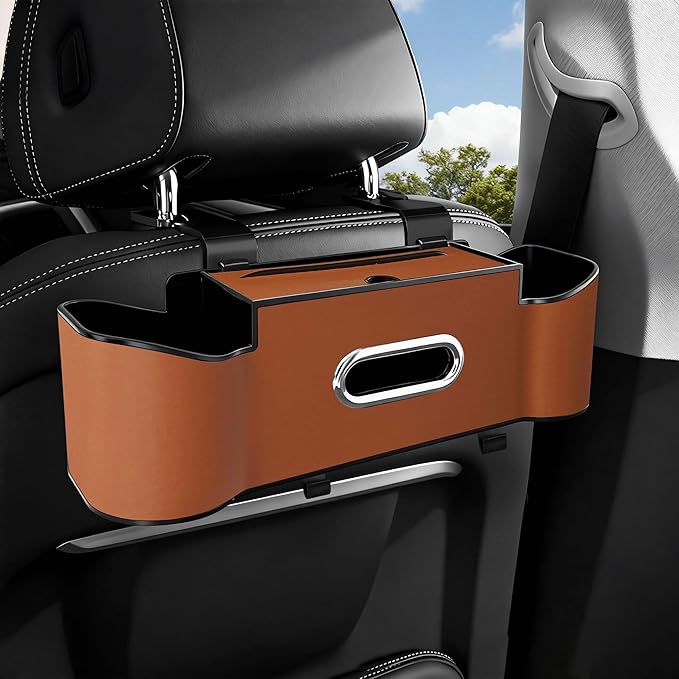 Backseat Car Organizers,4 in 1 Multifunctional Car Back Seat Storage Box with Drink Cup Holder Tissue Box, for Hold Phone,Snacks, Drinks, Handbag (LightBrown)