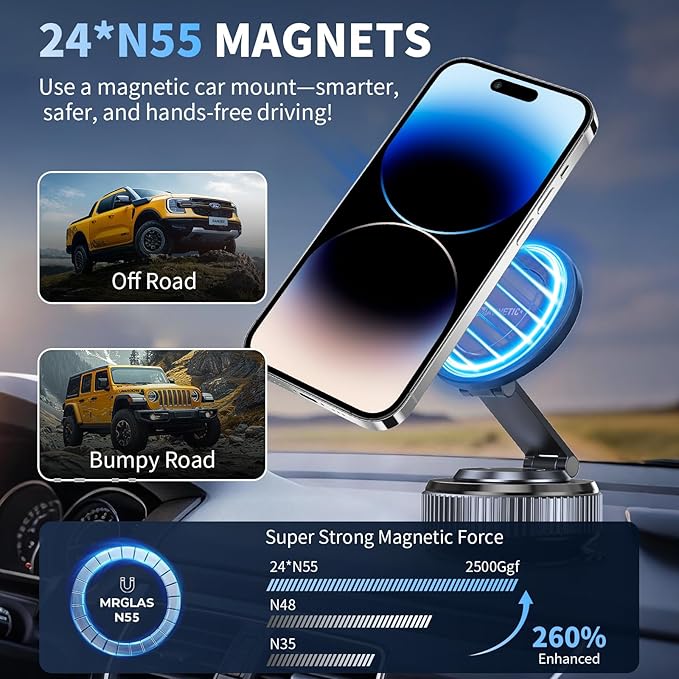 - [No Hole Design - Strongest Magnetic Hold]Reinforced Durability & Strong Magnetic Hold: This upgraded magnetic mount boasts exceptional sturdiness—it withstands drop tests without cracking or damage, ensuring long-term reliability in daily use. Its enlarged magnetic contact area enables full fit snugly with your phone’s magnets, eliminating gaps that cause instability; equipped with 24 high-performance N55 magnets, it delivers 300% stronger adsorption than standard magnetic mounts (generating up to 2800gf of suction) to keep your phone secure and stable at all times.