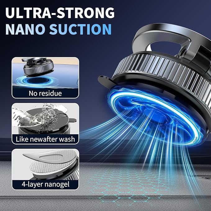- 【Upgraded Vacuum Suction Cup】Our suction cup phone mount features advanced nano-gel technology for instant stick-and-secure grip—no adjustments needed,This car phone mount adopts rotary locking to achieve maximum vacuum adsorption, and the gel suction cup prevents air from entering the cup—no sticky pads needed! It secures firmly to both smooth dashboards and textured surfaces, boasting a load capacity of 96 lbs. Even on bumpy roads or during off-roading, your phone remains locked in place.