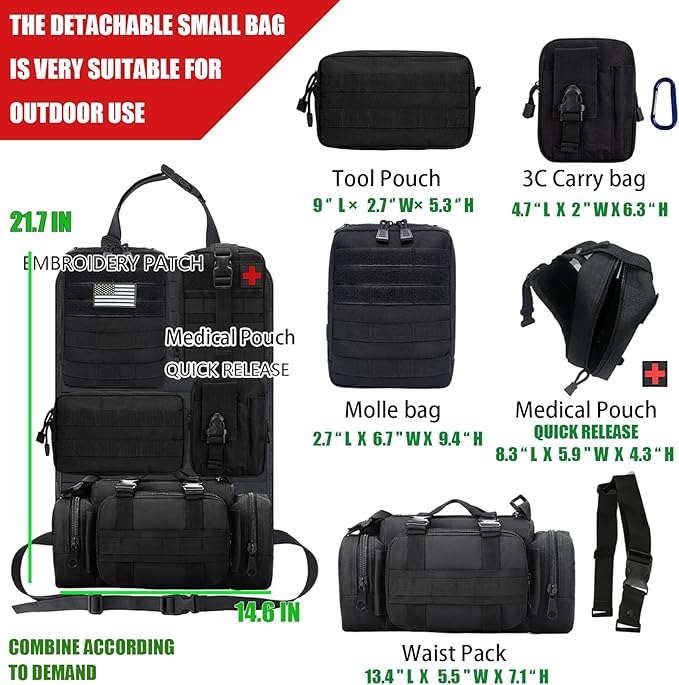 - Package included:1*tactical molle seat back organizer,1*Tactical Molle Bag,1*Tool pouch,1*Cell Phone Pouch,1*Medical Pouch,1*Multipurpose Waist Pack.1*Removable shoulder strap.1*biner.Can protects your seat from scratches and stains.