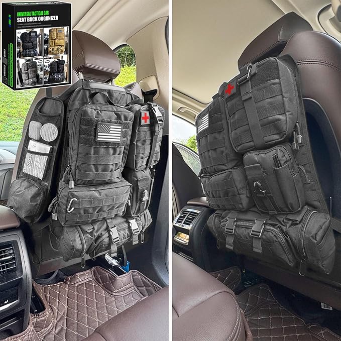 - 【Great Storage System】Suitable for most Vehicles models:Fit for most car seat back,For Jeep SUV, truck, pickup,etc.Car seat storage can store all of our loose items,like phone,ipad,wallets,maps,flashlight,books,first aid kid,tactical gear, and other items