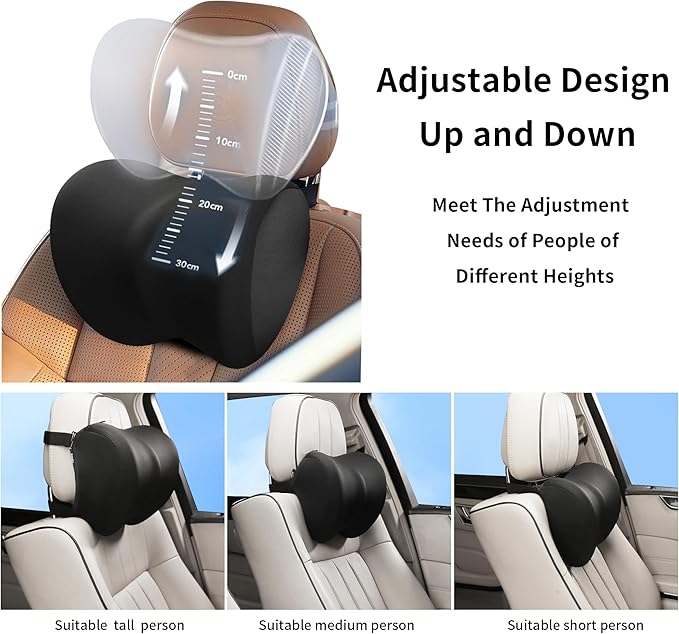 - 【Adjustable Design】If the car headrest is too high, it will push the head forward, while if it is too low, it will squeeze the shoulders and push your body forward. To solve this problem, our car head pillow adopts an up-and-down adjustable design, addresses the issue and enables people of different heights to find a position that suits their necks. The adjustment straps of our headrest pillow are detachable. Both ends of the adjustment straps have a metal hook with a loop shape. On both sides of the headrest's back, there is a strap with holes. Different holes correspond to different heights. Just find the position that suits you and lock the hook in the hole.