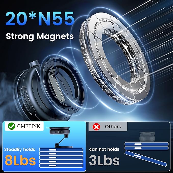 - Super Strong Magnetism: GMETINK equipped with 20 high-performance N55 magnets, this holder provides a strong magnetic force of up to 2400gf, having undergone over 2000 repeated magnetic attraction tests. Even under bumpy conditions, sudden braking, or sharp turns, your phone will remain firmly in place.