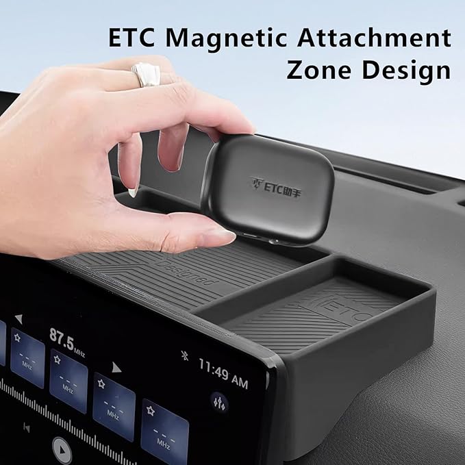 - High-End Design: Featuring a silicone pattern, it aesthetically adorns the center console cup holder and enhances the overall class.It can be easily hidden behind the original multimedia display, ensuring it is always ready for use. Furthermore, this storage box is equipped with a magnetic adsorption device to secure ETC (Electronic Toll Collection) devices.