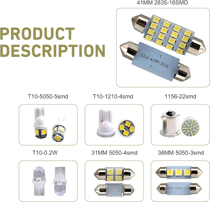 - Package Include: The package comes with 42 pieces of LED lights interior car lights in 7 models, they are respectively is 6 x 31 mm 4SMD LEDs, 6 x 41 mm 16SMD LEDs, 6 x 36 mm 3SMD LEDs, 6 x T10 5SMD LEDs, 6 x T10 4SMD LEDs, 6 x T10 0.2W map LEDs, 6 x 1156 22 smd cornering and brake LEDs.