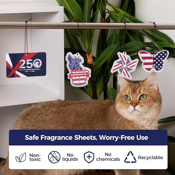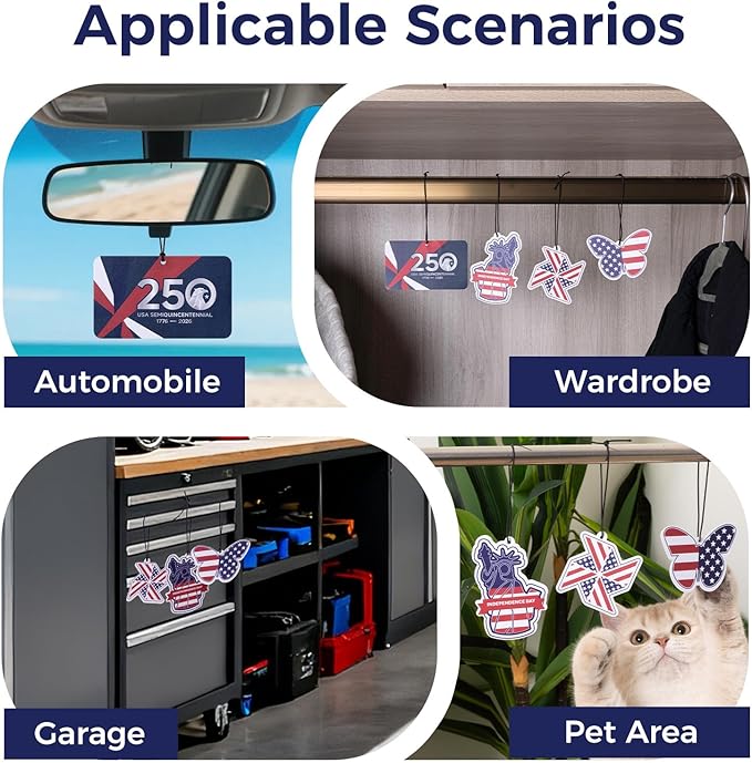12Pcs America 250th Anniversary Independence Car Air Freshener Hanging American Flag Provides Long-Lasting Fragrance For Cars And Homes Black Ice, Berries, Ocean, New Car, Air Freshener