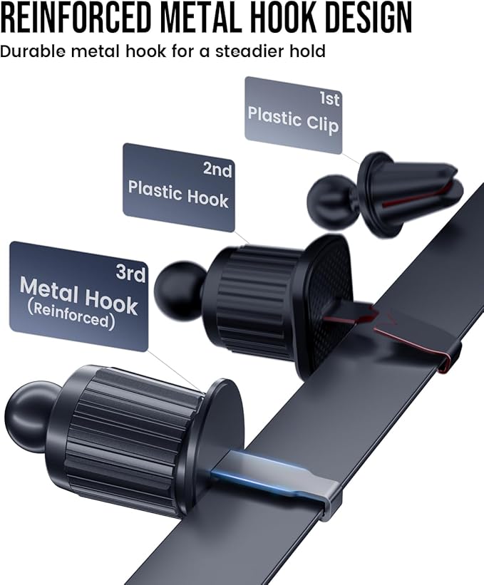 - UPGRADED VENT CLIP, ROCK-SOLID HOLD – Screw-tightened telescopic metal hook grips the vent firmly, helping keep your phone stable on bumpy roads and sharp turns.