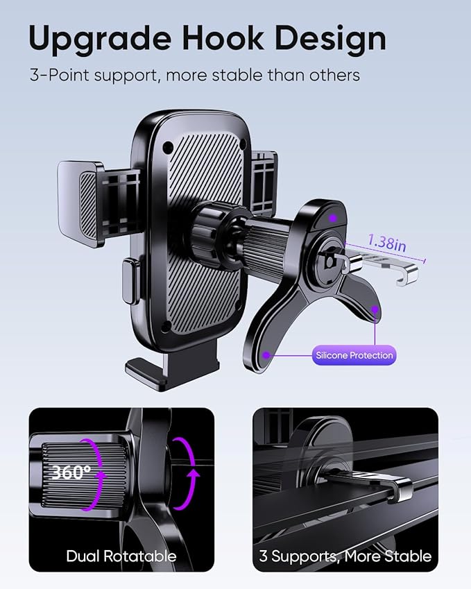 - 【3-Point Support Air Vent Hook】This mount is equipped with a 3-point support air vent hook, whitch is more stable than the traditional 2-point support. we have designed the hook to 360° rotate so that the holder can fit more air vent of different shapes. Screw the clamp and the clip hook will catch one of the car air vent blades tightly, even if you hit a bump or a sharper turn.
