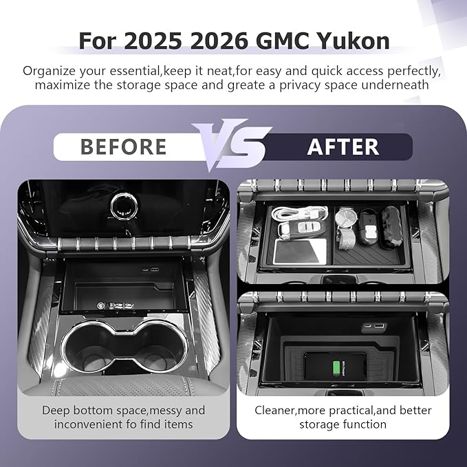- Maximize Your Space — organizer for Suburban console,2025 Yukon accessories, Yukon glove box organizer increase the available space of the center console, you can easily store and access your items, such as pens, coins, keys, wallets, etc., and quickly access items without digging holes. Orderly storage helps your 2025 Yukon center console get rid of the messy storage environment