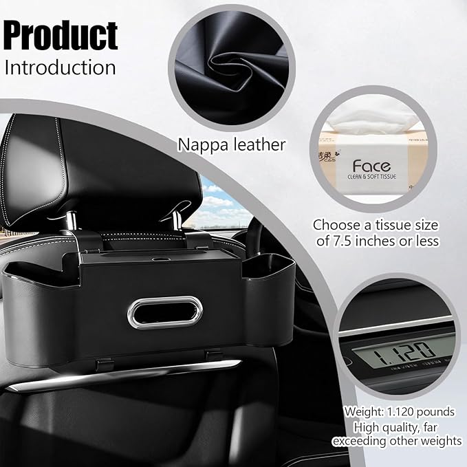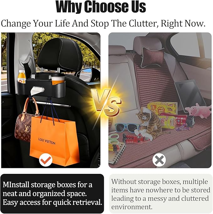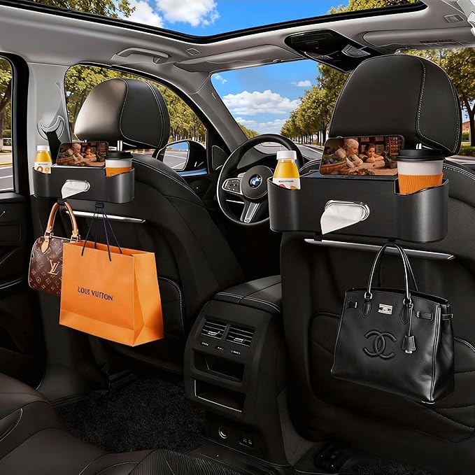 - 【4 in 1 Multifunctional Car Backseat Storage - Solve Clutter Completely】 Keep your car tidy with 4 integrated storage compartments: dedicated holders for drinks/cups (fits kids’ water bottles), tissue box, phone (compatible with most smartphones), snacks, and handbags. Easy to access while driving, perfect for storing kids’ travel essentials, road trip supplies, or daily commute items—maximizes car storage space without mess.