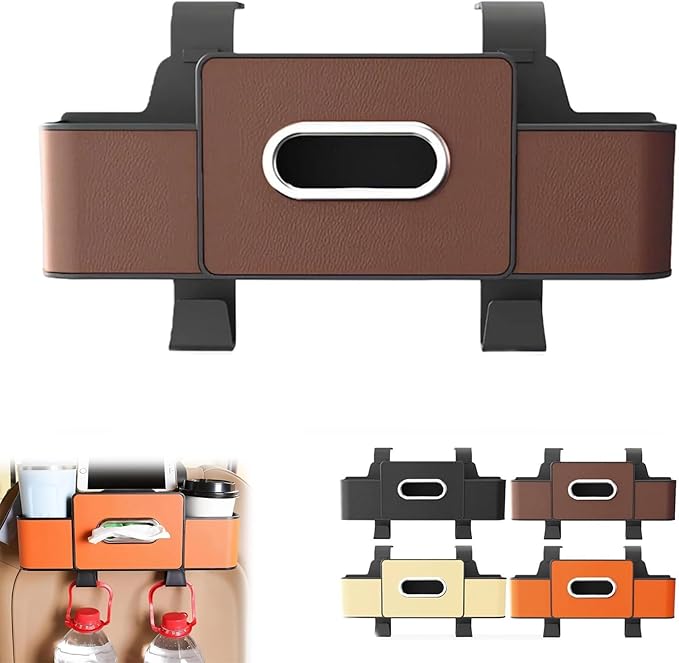 3 in 1 Car Backseat Organizer with Cup Holder, Leather Multifunctional Seat Back Storage with Tissue Box, Phone Holder and Hooks, for Hold Phones, Snacks, Drinks, and Handbags (Brown,1PCS)