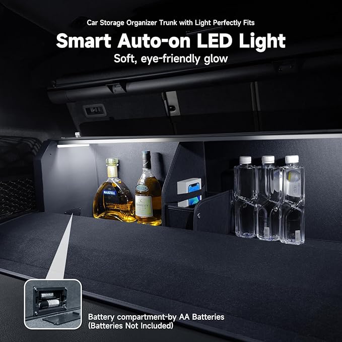 - 【Powered by AA Batteries】 The large trunk organizer with lighting system is powered by 4 AA batteries (not included), ensuring that you can easily replace the batteries when needed. This battery-powered design gives you the freedom to use the organizer anywhere, without the need for a power outlet or complicated wiring