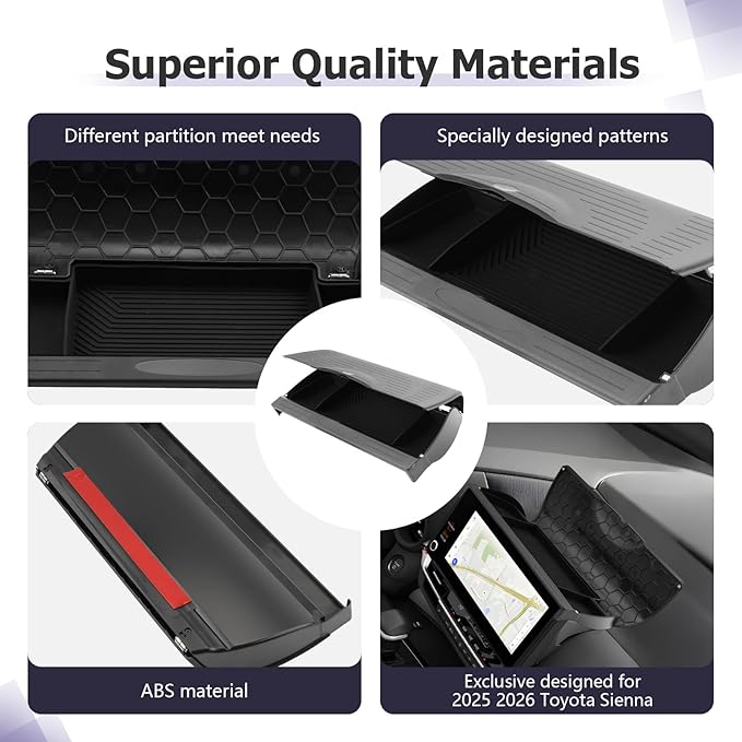 - Easy to clean — The 2026 Sienna accessories,2025 Sienna accessories,car armrest glove box 2025 Sienna accessories contains a rubber tray bottom liner, which can be placed when picking up keys or other items to reduce collision noise. Sienna glove box organizer can also be easily taken out and wiped with a wet wipe for easier cleaning