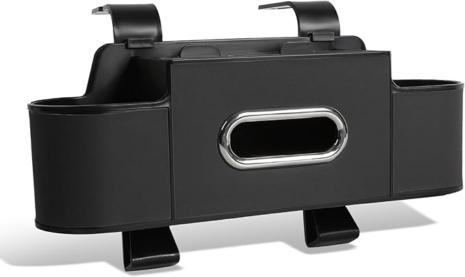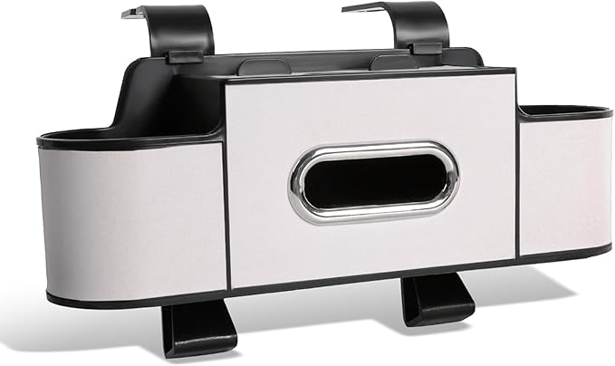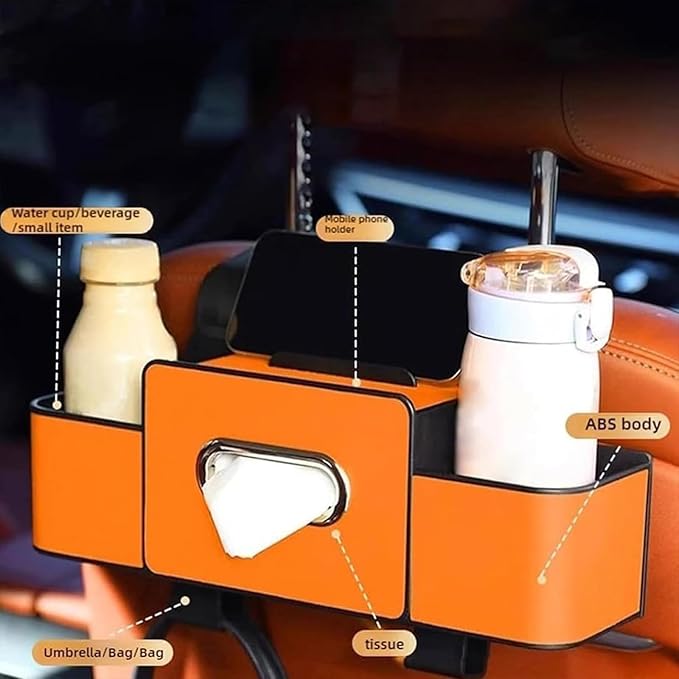- All-in-One Car Organizer for Seat Back Storage This car organizer combines cup holders, tissue box slot, phone holder, and multiple storage compartments in one compact unit. Designed to reduce seat-back clutter and keep drinks, snacks, and travel essentials within easy reach for both front and back seat passengers.