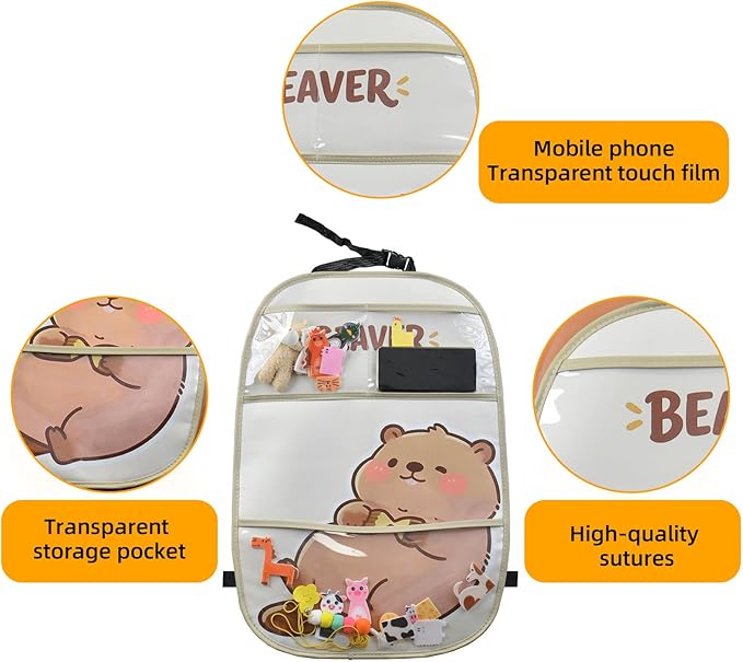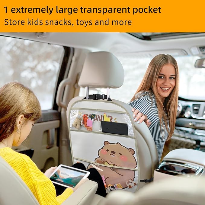 - MULTI-FUNCTIONAL DESIGN: Features a foldable table tray, touchable clear tablet holder pocket, and multiple storage compartments to keep car organized during travel