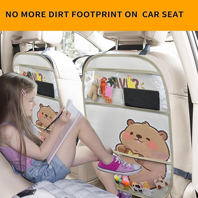 2-Pack kids Leather Car Backseat Organizer with Foldable Table Tray, Car Storage Organizer with Tablet Holder, Car Seat Back Protectors Kick Mats, Travel Accessories (Beaver)